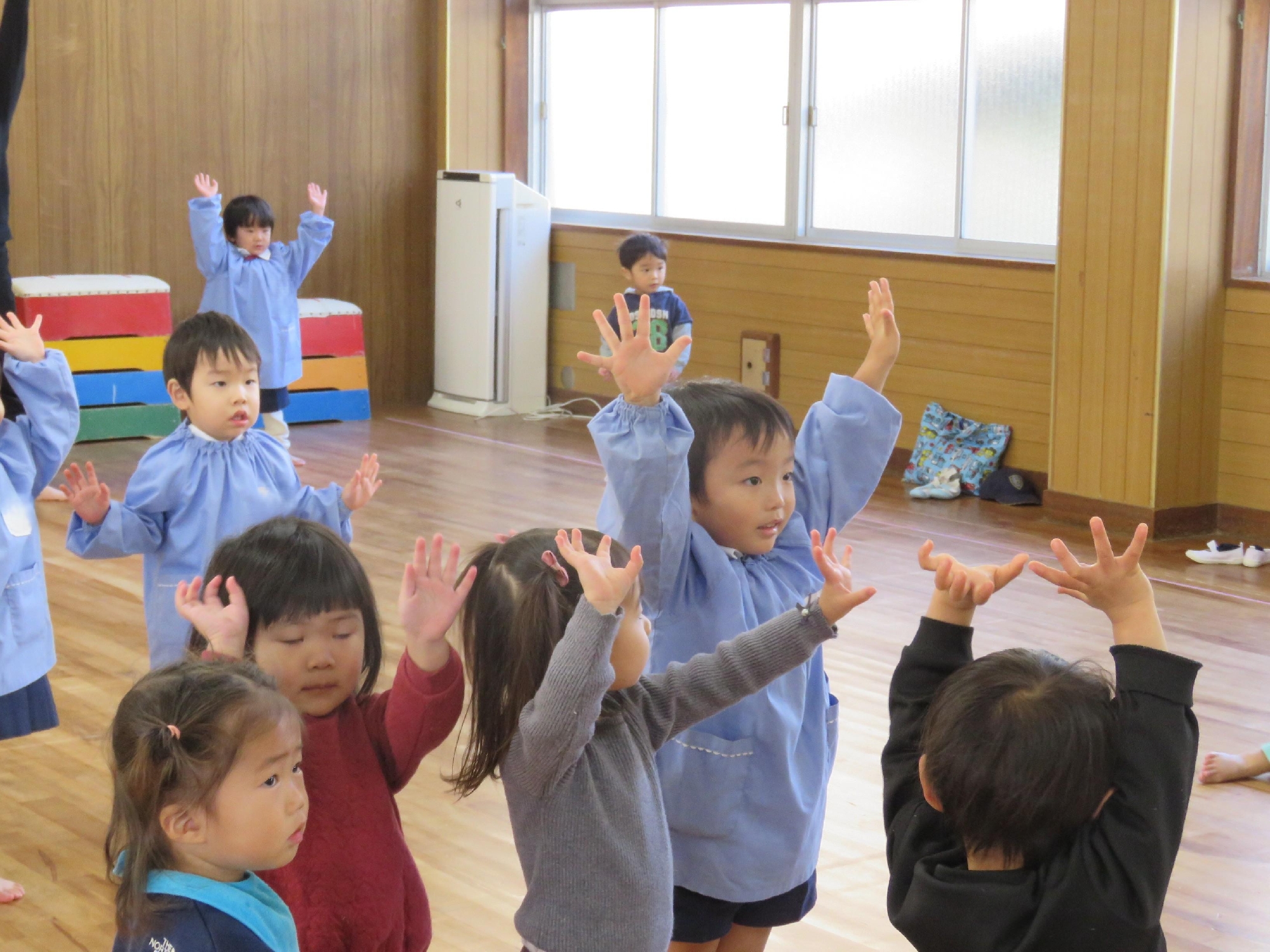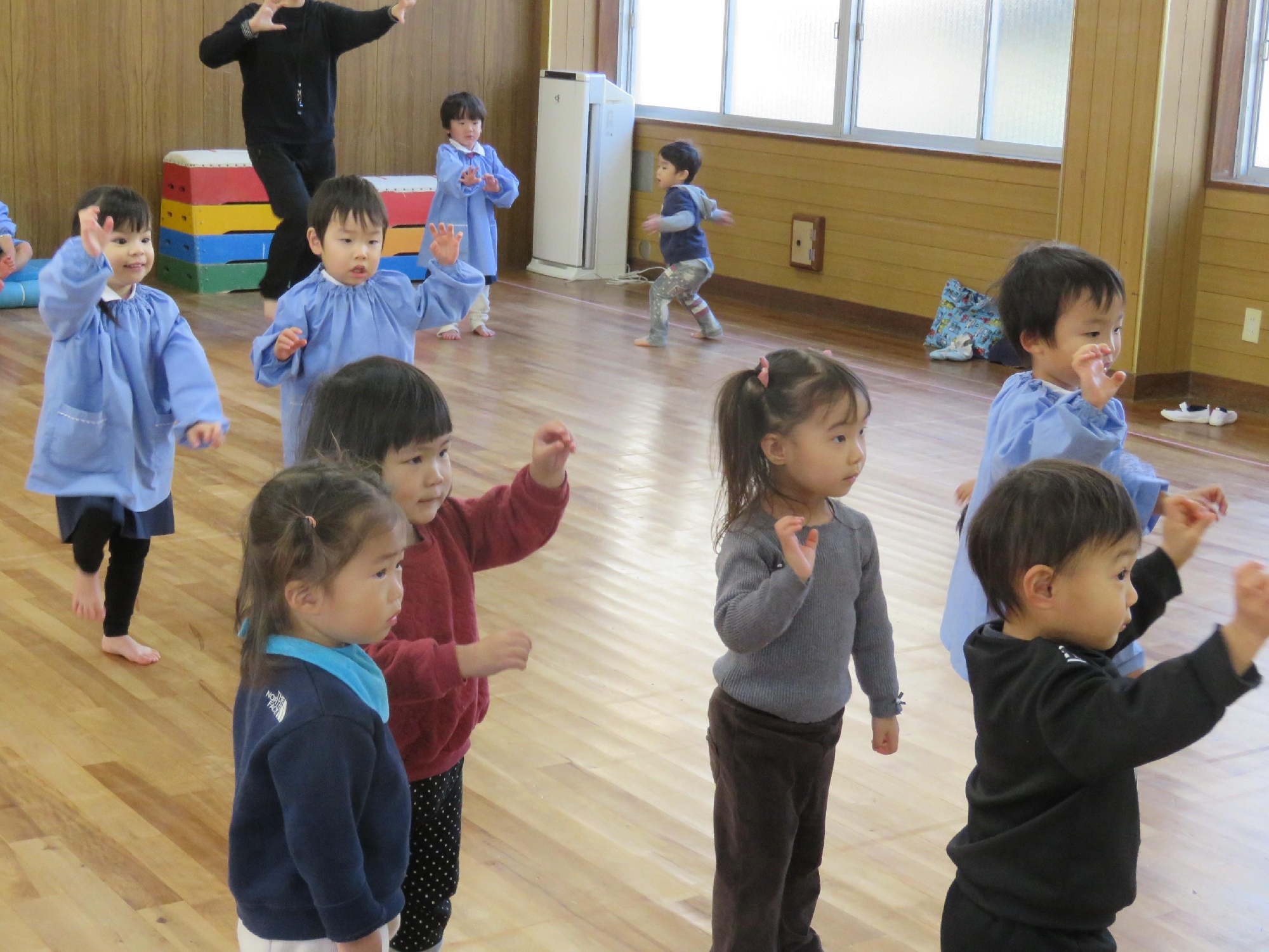 今回はD組さん(満3歳児クラス)も一緒に体操を行いました。